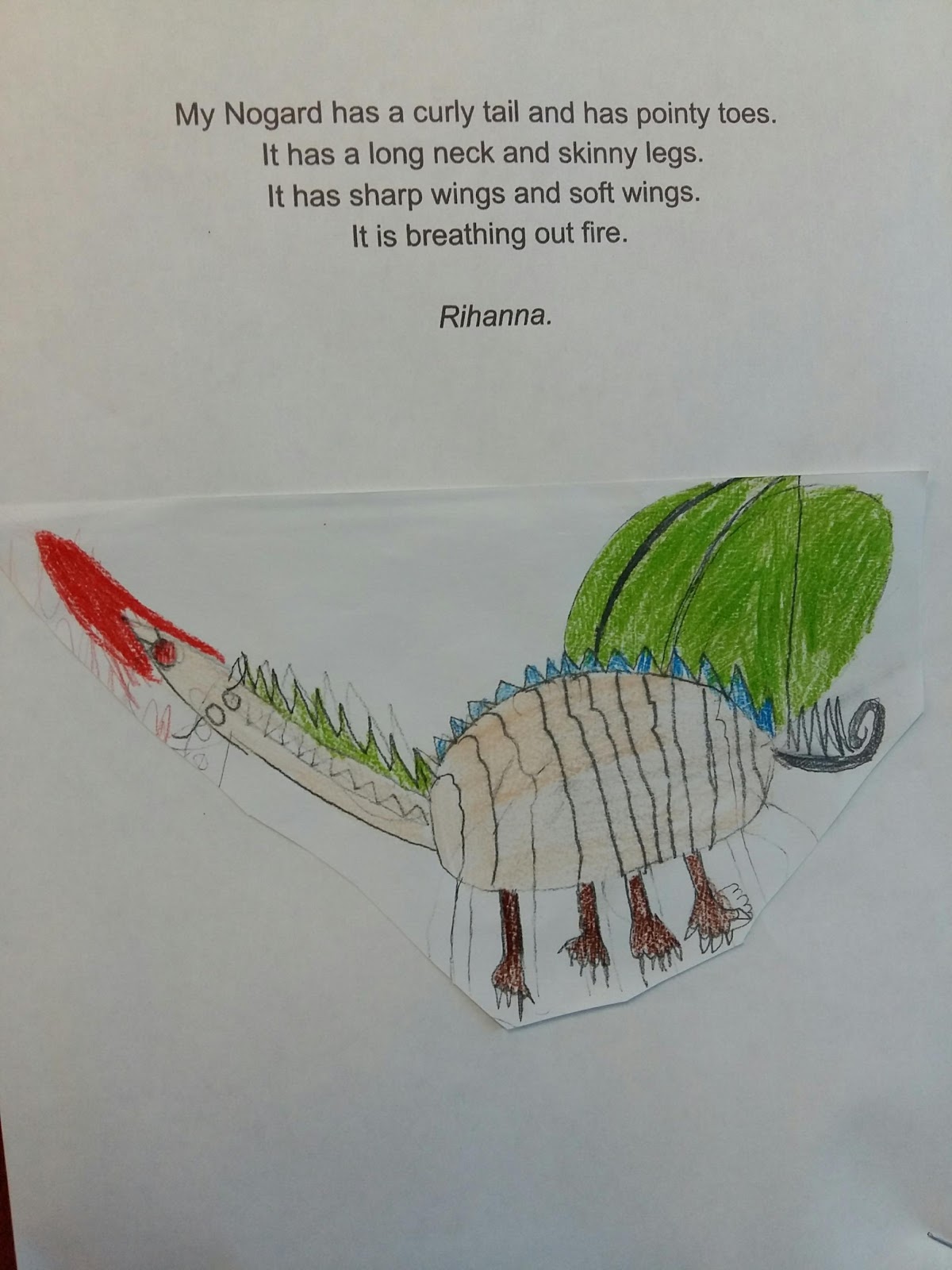 The nogard is an animal. It has an oval-shaped body. It has a long neck and tail. The top of the neck, back and tail are covered with a row of triangular-shaped plates. The nogard’s head is shaped like a long triangle. It has big eyes and eyebrows that stick out. It also has big nostrils. Its body is covered with scales. The nogard has four short legs. At the end of each leg is a foot with five toes. Each toe has a sharp claw at the end. The nogard has two wings attached to its body. These are located behind the front legs towards the top of its back. Every nogard looks different and can be any colour of the rainbow."